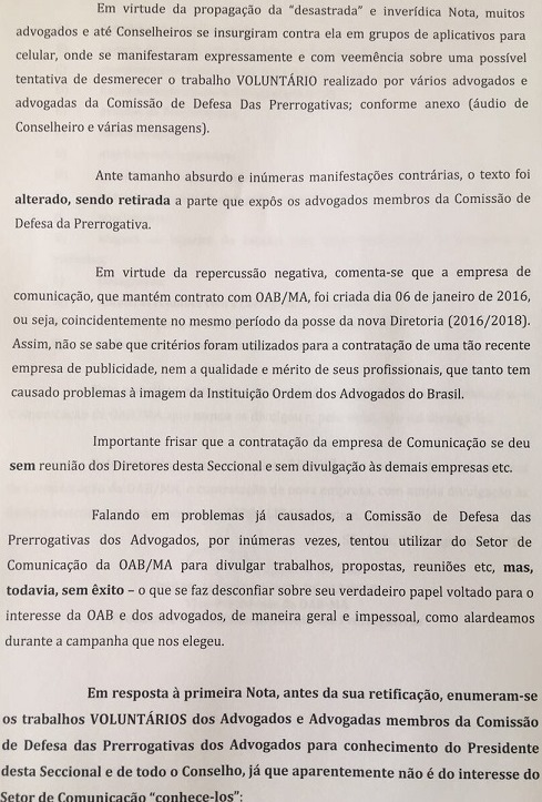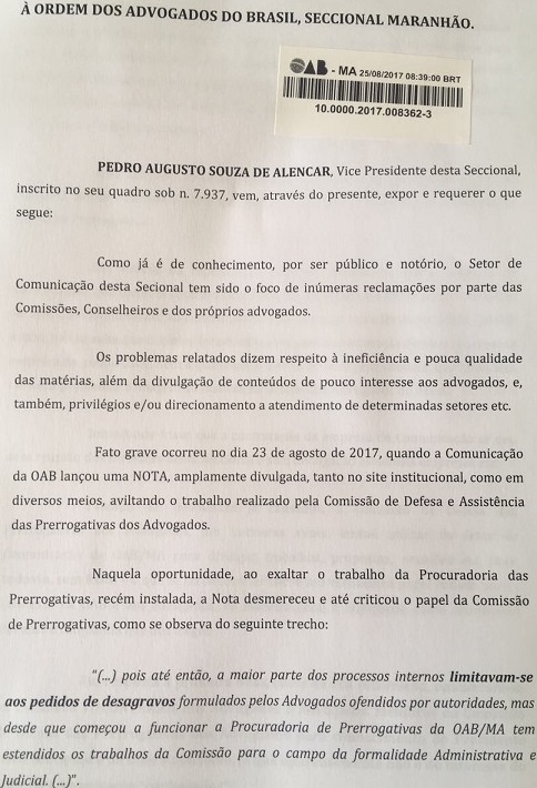 O vice presidente, como substituto legal, certamente deve ter assinado cheques de pagamento para essa empresa, além, claro da prestação de contas anual. Em 2016, a OAB/MA pagou R$ 2,1 milhões por serviços prestados por pessoas jurídicas. O ainda vice presidente Pedro Alencar, emitiu comunicado no último dia 25 de Agosto, solicitando a rescisão do contrato com a referida empresa de Comunicação, segundo ele, para “moralizar” a entidade, e a contratação de uma nova empresa.