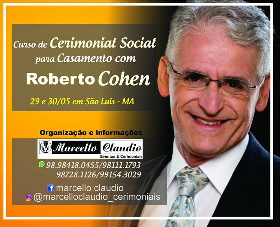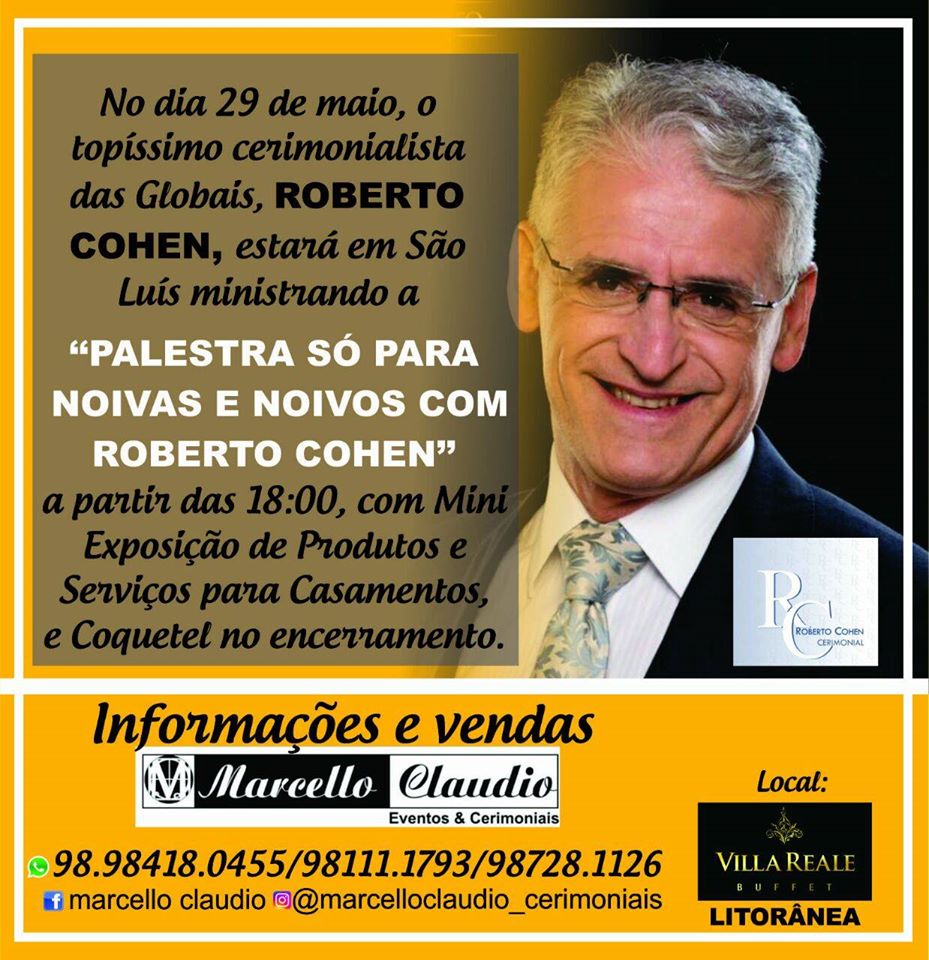 São Luís se prepara para receber, nos dias 29 e 30 de Maio, o cerimonialista mais famoso do Brasil: Roberto Cohen, na I Edição do MARIER- Exposições/ Noivos/Eventos. O profissional virá à capital maranhense para ministrar um Curso de Cerimonial Social para Casamento, voltado para os profissionais de eventos do Maranhão, e uma palestra para os noivos e noivas da cidade.