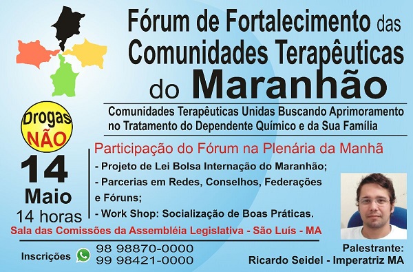 Está programado para esta quinta-feira (14), o I Fórum de Fortalecimento das Comunidades Terapêuticas do Maranhão, que tem por objetivos reunir e organizar como classe as Entidades que se destinam a acolher, cuidar, tratar e proteger dependentes químicos, além de discutir políticas públicas voltadas para a legalidade e aparelhamento das drogas no Maranhão.