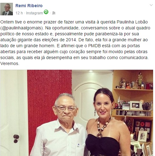 A situação não anda nada bem lá pras bandas do PMDB. O presidente estadual do partido, Remi Ribeiro, deu demonstrações claras na sua página pessoal que pretende levar a apresentadora e esposa do candidato derrotado, Lobão Filho, Paulinha Lobão, para adentrar as fileiras do PMDB. A intenção de Remi é lançar Paulinha para vereadora nas eleições de 2016. Será que cola?