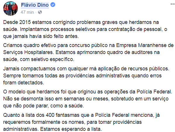O governador do Maranhão, Flávio Dino, se manifestou nas redes sociais sobre as denúncias envolvendo a Secretaria de Saúde do Estado. Ele diz na nota que “jamais compactuou com qualquer má aplicação de recursos, e que já solicitou à PF a lista dos 400 fantasmas, para que sejam tomadas as devidas providências.