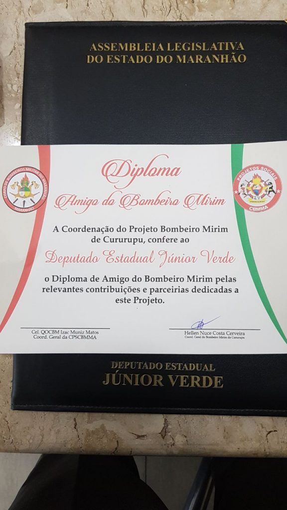 Desde o início do mandato, o deputado estadual Júnior Verde (PRB) tem apoiado o projeto Bombeiro Mirim em diversos municípios maranhenses como São Mateus, São José de Ribamar, São Luís, Penalva, entre outros. Na semana passada, o parlamentar foi homenageado com o diploma Amigo Bombeiro Mirim, em Cururupu, um reconhecimento pelas contribuições e parcerias dedicadas ao projeto.