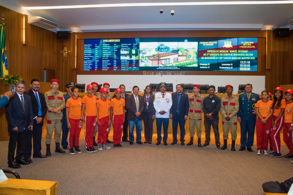 O deputado estadual Júnior Verde (PRB) presidiu na Assembleia Legislativa, nesta terça-feira (18), sessão solene para a entrega da Medalha do Mérito Legislativo “Manuel Beckman” ao 2º Sargento BM Carlos Marcone Martins Dias, um dos coordenadores do programa Bombeiro Mirim no Maranhão. O parlamentar tem atuação destacada nessa área, chegando a beneficiar 42 municípios maranhenses com o projeto.