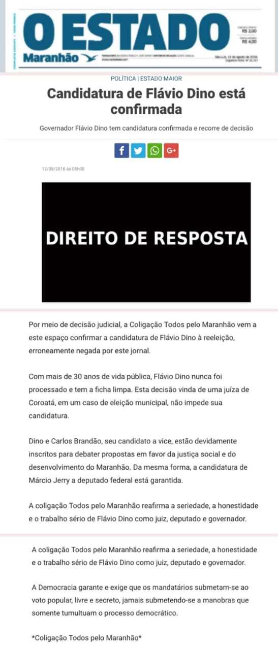 A verdade foi reposta com um direito conseguido na Justiça. A candidatura de Flávio Dino está confirmada e a mídia miranteana foi obrigada, sob pena de multa de R$ 100 mil, a restabelecer os fatos verdadeiro em relação a estabanada decisão de juíza de Coroatá.