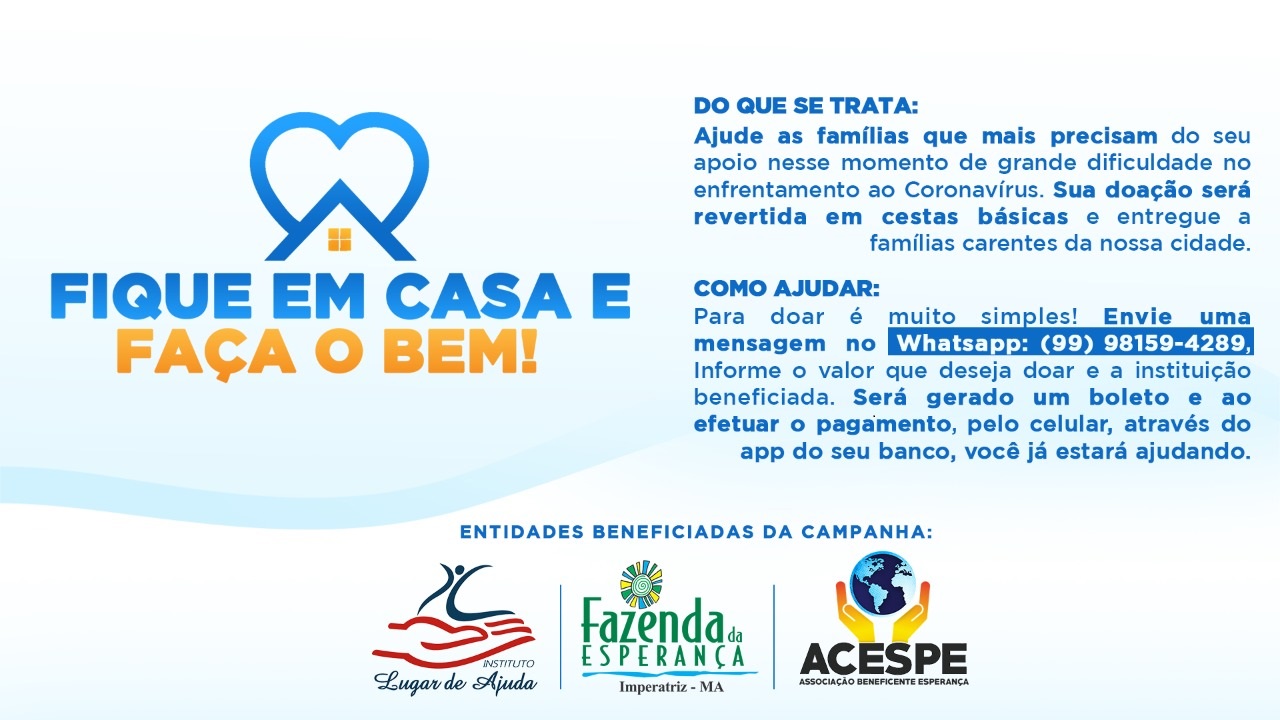 A Campanha foi criada com o intuito de ajudar aqueles que mais precisam de apoio em meio ao momento de pandemia global do Covid-19. O movimento tem por objetivo arrecadar recursos para a aquisição de cestas básicas que serão distribuídas por entidades filantrópicas de Imperatriz a famílias carentes e profissionais que estão impedidos de trabalhar durante o período de isolamento social.