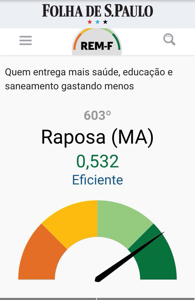 A cidade de Raposa, no Maranhão, é um dos municípios mais eficientes do Brasil. A afirmação é resultado de um levantamento feito pela Folha, em conjunto com o Datafolha, que mostra quais prefeituras entregaram mais serviços básicos à população, usando menor volume de recursos financeiros, levando em conta indicadores de saúde, educação e saneamento para calcular a eficiência da gestão e apresenta dados de 5.281 municípios, ou 95% do total de 5.569 de todos os municípios do país.