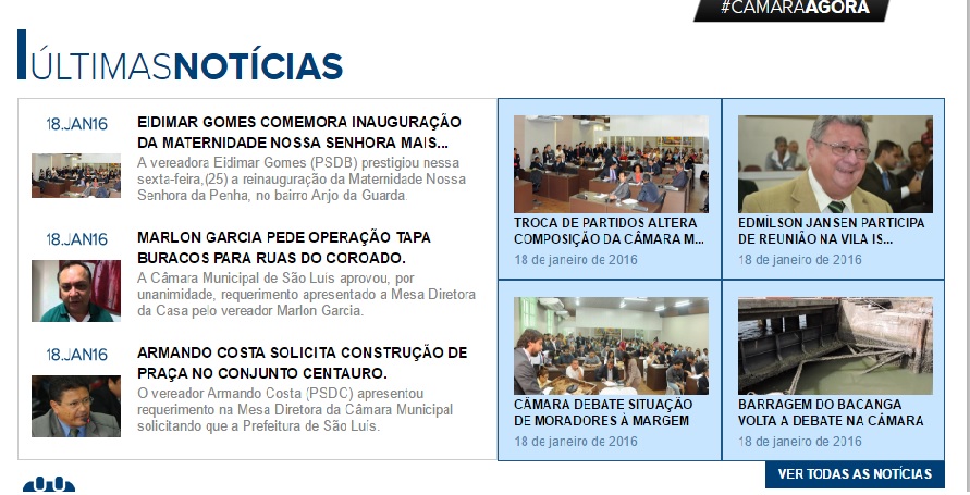Outro disparate encontrado, é que, até na página inicial do site, consta uma foto ainda da legislatura passada, ou seja, dentro do site, não existe absolutamente informação nenhuma, pura enganação. Já na parte de “Notícias”, o que se vê, são notícias velhíssimas, de Janeiro de 2016, ainda divulgando ações dos ex parlamentares.