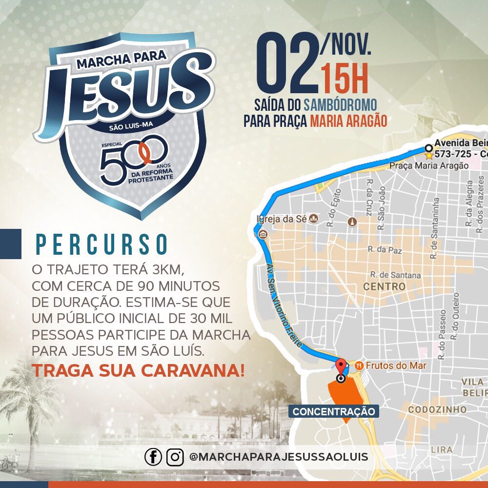 A Marcha para Jesus deste ano, em São Luís, que vem com o tema “500 anos da Reforma Protestante”, a Marcha para Jesus em São Luís ocorrerá no dia 2 de novembro (feriado) com concentração e saída às 15h do sambódromo, no Aterro do Bacanga, seguindo via Av. Beira Mar até à Praça Maria Aragão, no Centro, com previsão de término às 23h. Serão mais de 07 horas de adoração, louvor e evangelismo.