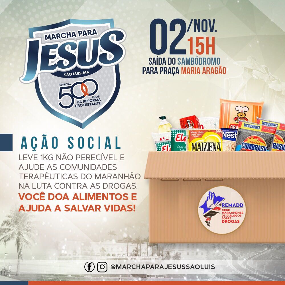A Marcha para Jesus, que também é de cunho social, traz mais uma vez a parceria com a Rede Maranhense de Diálogos sobre Drogas (REMADD) onde junto com a Diretoria da Marcha estará arrecadando alimentos para doar para comunidades terapêuticas que auxiliam no tratamento de dependentes químicos no Maranhão.