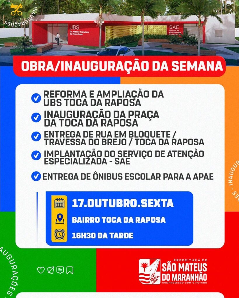 O prefeito Miltinho Aragão segue mantendo o ritmo acelerado de trabalho e inaugurações semanais em São Mateus do Maranhão. Nesta sexta-feira (17) o gestor realiza um grande ato popular ao lado do deputado federal Juscelino Filho, do ex-prefeito Ivo Rezende, do vice-prefeito Clóvis Bernardi, além de vereadores, secretários e lideranças locais e regionais.