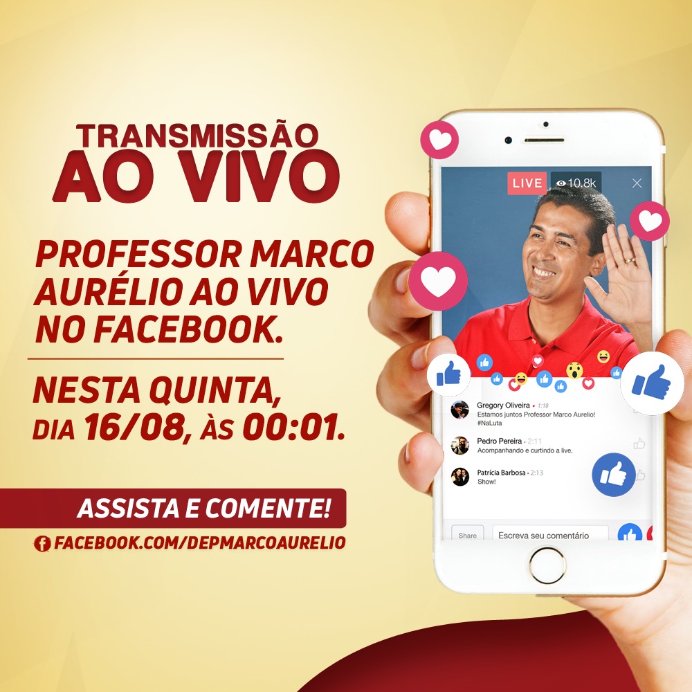Aproveitando o início oficial da campanha eleitoral para as eleições de 2018, o deputado estadual Professor Marco Aurélio (PCdoB), pré-candidato à reeleição, realizará uma live em sua página no Facebook no primeiro minuto da madrugada desta quinta-feira (16). Segundo o parlamentar este será o pontapé de uma campanha propositiva em que o mesmo apresentará resultados de lutas através do mandato e apresentará novas perspectivas, bem como fará questão de reforçar a pré-candidatura do Governador Flávio Dino.