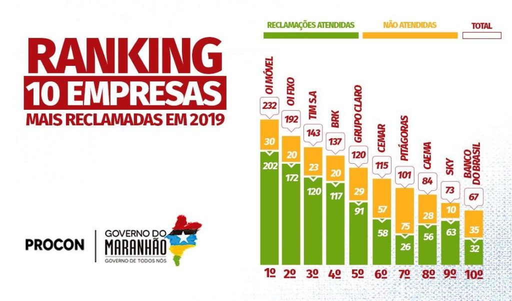 O Instituto de Proteção e Defesa do Cidadão e Consumidor do Maranhão (Procon/MA) divulgou, no domingo (15), Dia Mundial do Consumidor, o ranking das 10 empresas mais reclamadas, em 2019. O topo da lista foi ocupado pelas operadoras de telefonia Oi Móvel, Oi Fixo e TIM S.A.