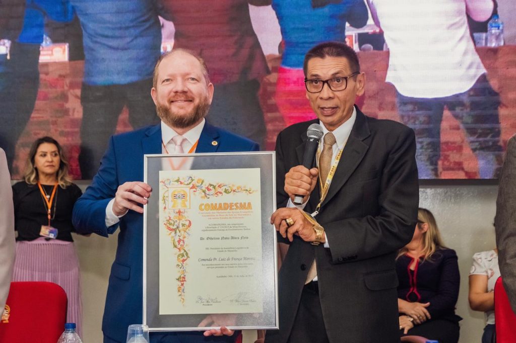 O presidente da Assembleia Legislativa do Maranhão, deputado Othelino Neto (PC do B), foi homenageado, neste sábado (13), com a comenda “Pastor Luiz de França Moreira”, maior honraria da Igreja Evangélica Assembleia de Deus do SETA, entregue durante a Convenção dos Ministros das Igrejas Evangélicas Assembleias de Deus no Maranhão (Comadesma).