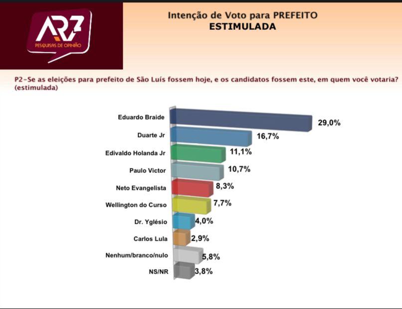 De acordo com o instituto AR7, de São Paulo, no cenário estimulado o atual prefeito Eduardo Braide aparece com 29,0%, seguido do deputado federal Duarte Júnior com 16,7%, do ex-prefeito Edivaldo Holanda Júnior com 11,1% e do presidente da Câmara Municipal de São Luís, Paulo Victor com 10,7%.