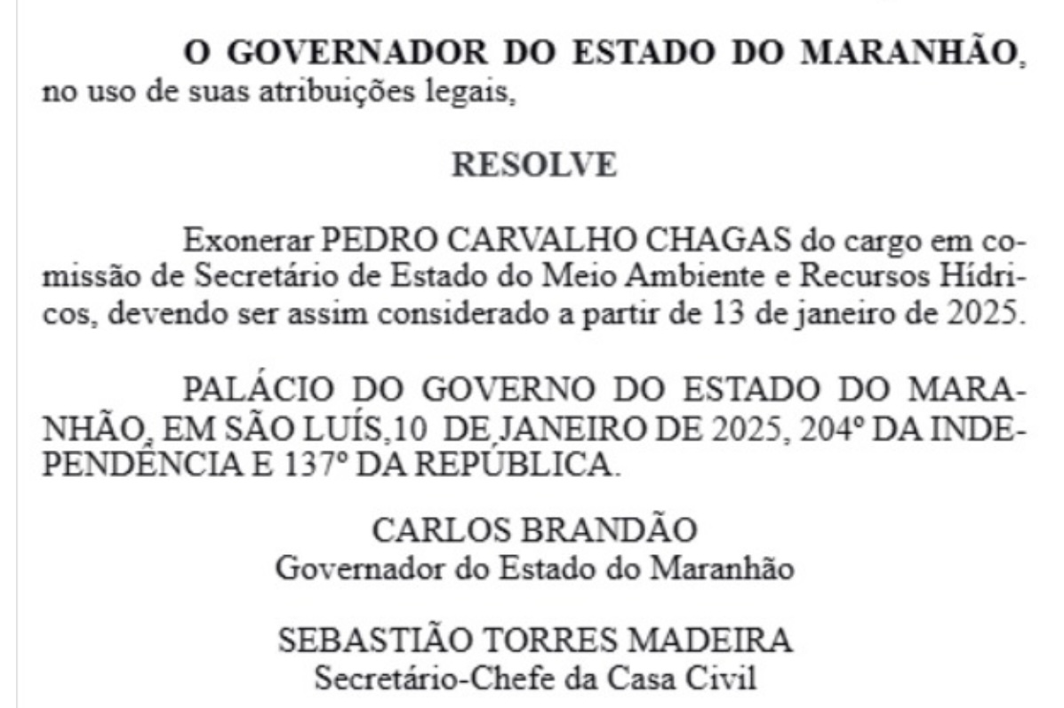 O advogado Pedro Chagas foi exonerado do comando da Pasta de Meio Ambiente do Governo Carlos Brandão. O ato foi publicado no Diário Oficial.