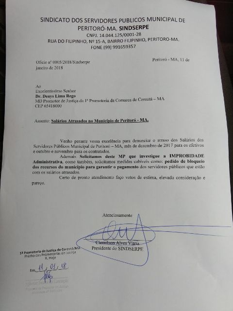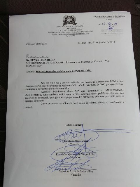 Na denúncia, os vereadores e os sindicalistas pediram ao promotor Denys Lima Rego, para investigar e apurar o ato de improbidade administrativa, alegando que a prefeitura recebeu, só no mês de dezembro de 2017, mais de R$ 4 milhões.