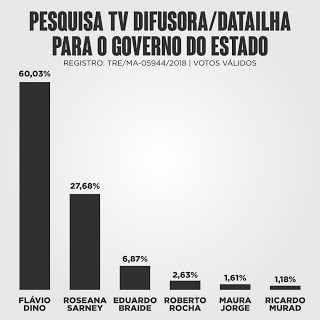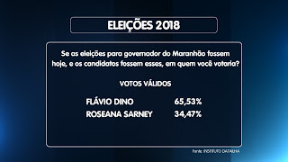 Encomendado pela TV Difusora a cinco meses do pleito, o levantamento aponta que Flávio Dino venceria a disputa com mais de 30 pontos percentuais na frente da segunda colocada, a ex-governadora Roseana Sarney (MDB), que aparece com 27,68% dos votos válidos.