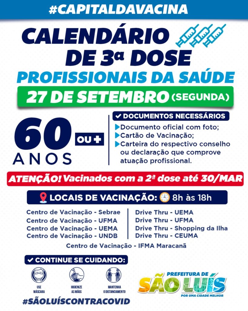 Inicialmente, conforme planejamento da Campanha Municipal de Vacinação, a Secretaria Municipal de Saúde (Semus) vai vacinar os profissionais com idade a partir de 60 anos e que tomaram a segunda dose até 30 de março. Este público poderá ir a qualquer um dos nove pontos de vacinação da Prefeitura, instalados nos centros municipais de vacinação do Multicenter Sebrae, Universidade Federal do Maranhão (UFMA), Universidade Estadual do Maranhão (UEMA), Instituto Federal de Educação, Ciência e Tecnologia do Maranhão (IFMA) Maracanã e Drive-thru do Ceuma, Ufma e Shopping da Ilha, que funcionam das 8h às 18h, levando documento de identificação com foto e o cartão de vacina.