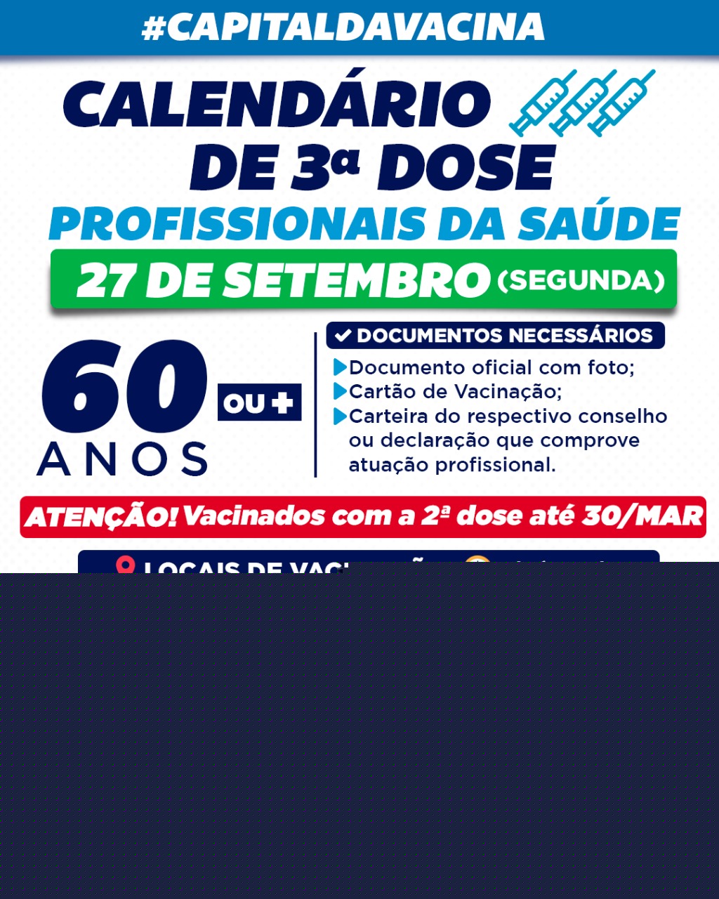 O prefeito Eduardo Braide anunciou, em suas redes sociais, o início da aplicação, nesta segunda-feira (27), da terceira dose ou dose de reforço contra a Covid-19, em profissionais da saúde a partir dos 60 anos A ação segue recomendação do Ministério da Saúde (MS). São Luís já vacinou com a terceira dose 4.672 idosos e imunossuprimidos, desde o dia 26 de agosto.