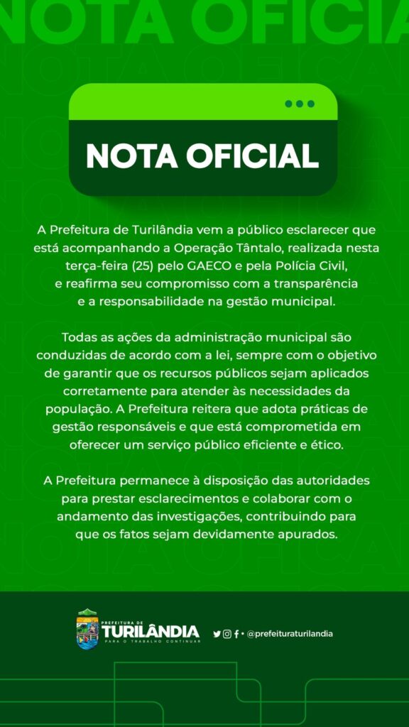 A Prefeitura de Turilândia vem a público esclarecer que está acompanhando a Operação Tântalo, realizada nesta terça-feira (25) pelo GAECO e pela Polícia Civil, e reafirma seu compromisso com a transparência e a responsabilidade na gestão municipal.