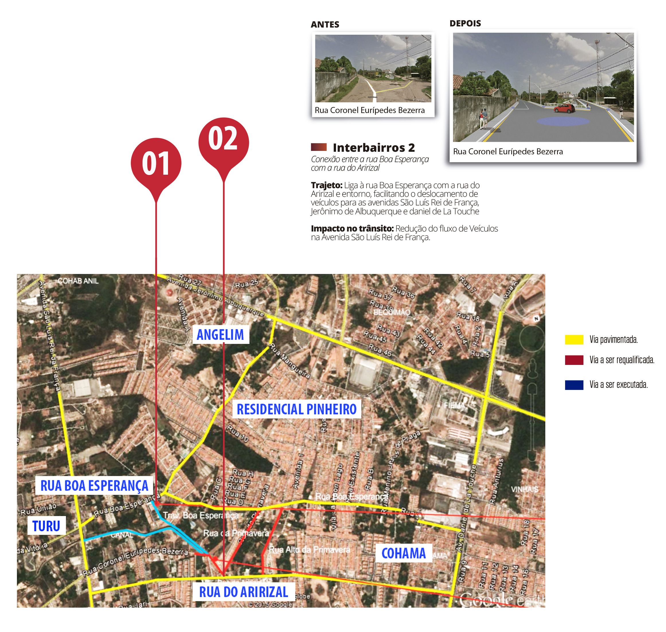 Entre as 14 intervenções do Projeto Interbairros, executado pelo Governo do Estado em parceria com a Prefeitura de São Luís, está a conexão entre a Rua Boa Esperança, no Turu; e a Rua do Aririzal, na Cohama. Esta intervenção vai facilitar o trânsito entre os dois bairros. Serão quatro importantes intervenções: a requalificação da Rua Alto do Primavera e da Rua Primavera; a execução da Travessa Boa Esperança e da Rua Eurípedes Bezerra, por onde passa o Canal do Gangan.
