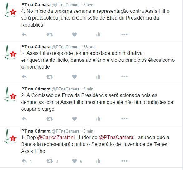 A bancada do PT na Câmara já disse que vai entrar com uma representação contra Assis Filho, junto à Comissão de Ética da Presidência da República.