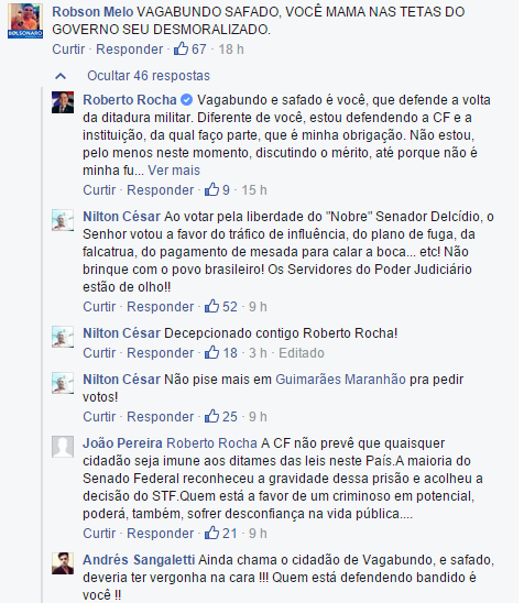 O destemperado senador maranhense, Roberto Rocha, não teve papas na língua e bateu boca com um internauta em sua rede social. O motivo foi o voto do senador, ter sido favorável à soltura do senador petista Delcídio Amaral, preso pela PF na manhã de quarta-feira (25). A maioria dos senadores votaram para que o senador permanecesse preso. Foram 59 votos a favor da prisão, contra 13 (coincidentemente, o número do PT), mais uma abstenção.