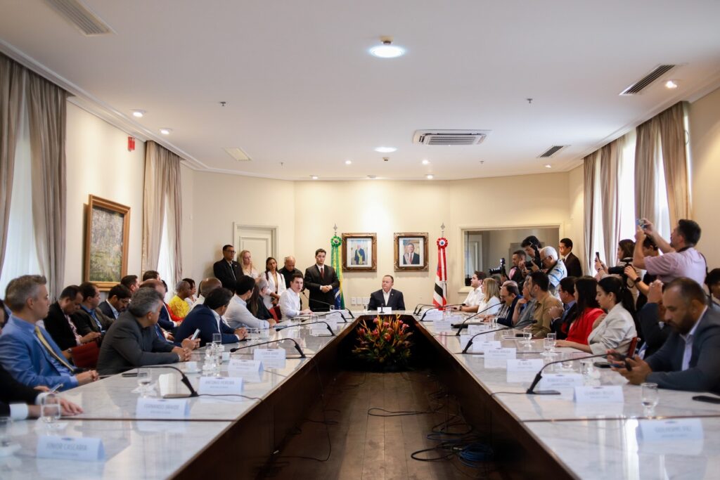O governador Carlos Brandão e o ministro das Cidades, Jader Barbalho Filho, assinaram ordens de serviço para obras do Novo Programa de Aceleração do Crescimento (Novo PAC) – Sustentabilidade e Desenvolvimento no Maranhão. Os investimentos somam mais de R$ 47 milhões em recursos federais e estaduais para obras de esgotamento sanitário, hidrometração e estação de tratamento de esgoto na Grande Ilha. A solenidade aconteceu nesta segunda-feira (14), no Salão de Atos do Palácio dos Leões, em São Luís.