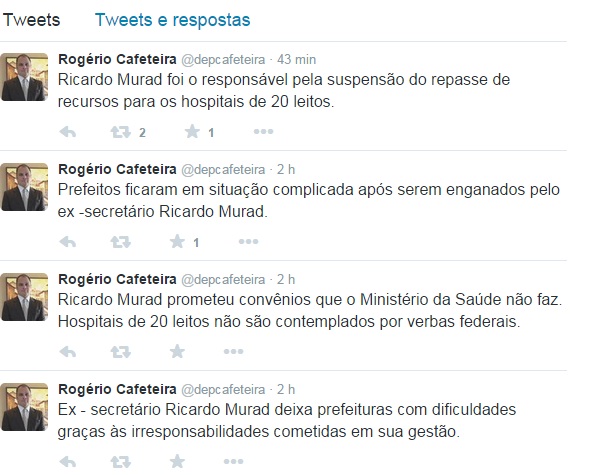 O deputado estadual e líder do Governo na Assembleia, Rogério Cafeteira, resolveu se manifestar, por meio de seu twitter, sobre os problemas com repasses de alguns hospitais do Maranhão, culpando por completo, Ricardo Murad, pelo grande “feito” à frente da saúde no Estado, durante a gestão passada.