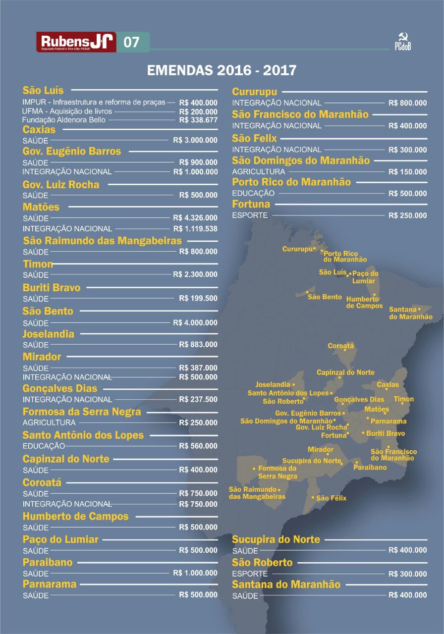 O deputado federal Rubens Jr. (PcdoB) organizou a destinação de suas emendas parlamentares dos anos de 2016 e 2017 para suas principais bases políticas. Foram quase R$ 30 milhões em áreas como saúde, integração nacional, agricultura, esporte e educação para 29 municípios maranhenses. Os recursos foram voltados para compra de equipamentos e ambulâncias em hospitais, reformas em escolas e fomento à agricultura, compras de tratores, construções de mercados, bem como investimentos em projetos esportivos.