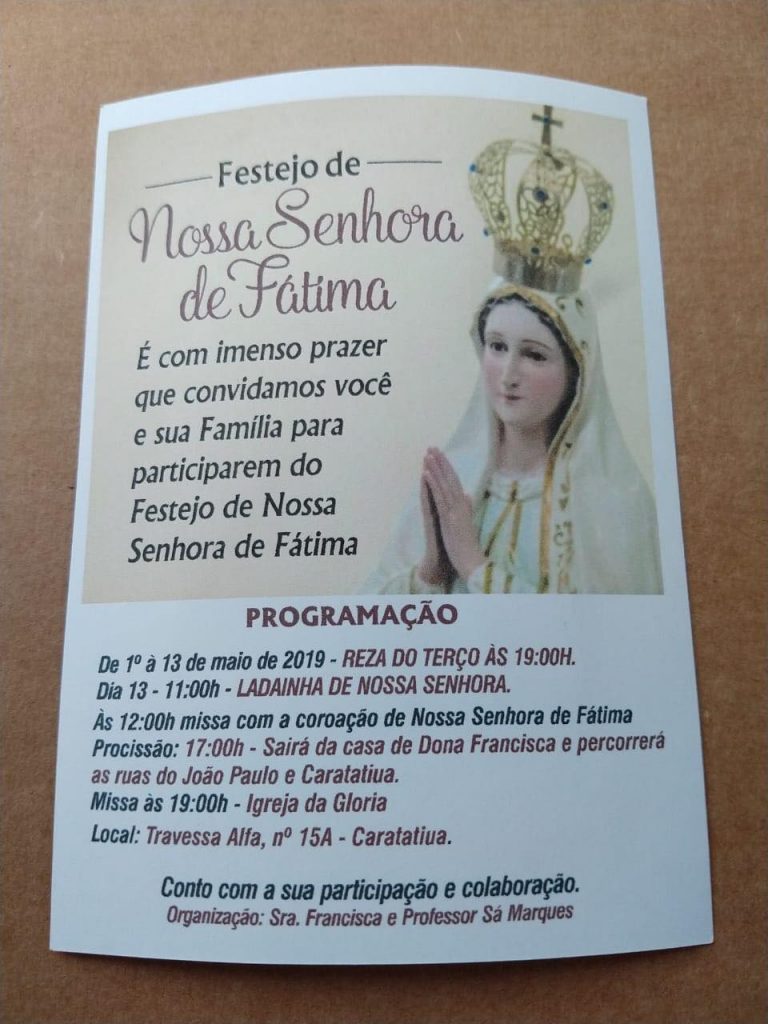 O vereador Sá Marques, que é ligado as tradições culturais maranhenses desde que nasceu, por conta de sua Mãe, a saudosa Lili Marques, convida a população ludovicense para participar do Festejo de Nossa Senhora de Fátima, que está acontecendo desde o início deste mês de Maio.