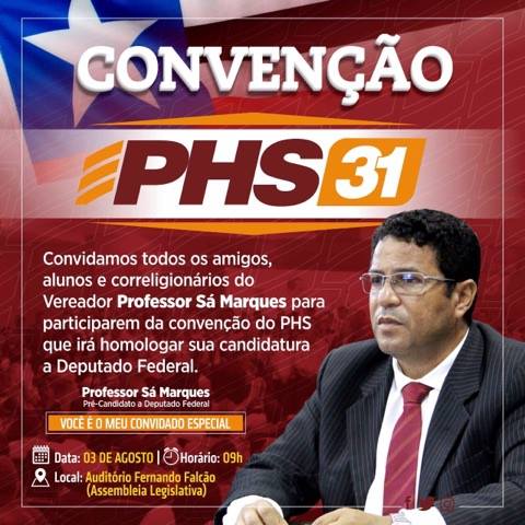 Tudo pronto para a Convenção Estadual do Partido Humanista da Solidariedade (PHS), que homologará a candidatura do Professor, Historiador, Policial e Vereador, Sá Marques,para disputar uma vaga na Câmara Federal nestas eleições de 2018.