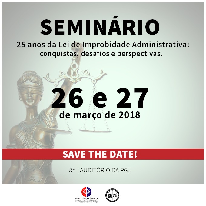 Para celebrar sua criação, discutir seus avanços e abordar as perspectivas, o Ministério Público do Maranhão, por meio do Centro de Apoio Operacional de Defesa do Patrimônio Público e da Probidade Administrativa vai promover nos dias 26 e 27 de março de 2018, o Seminário 25 anos da Lei de Improbidade Administrativa: conquistas, desafios e perspectivas. O evento será realizado no auditório da Procuradoria Geral de Justiça, a partir das 8h.