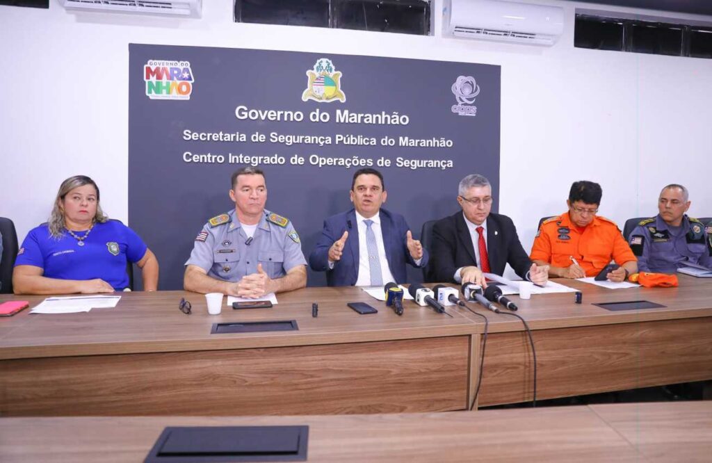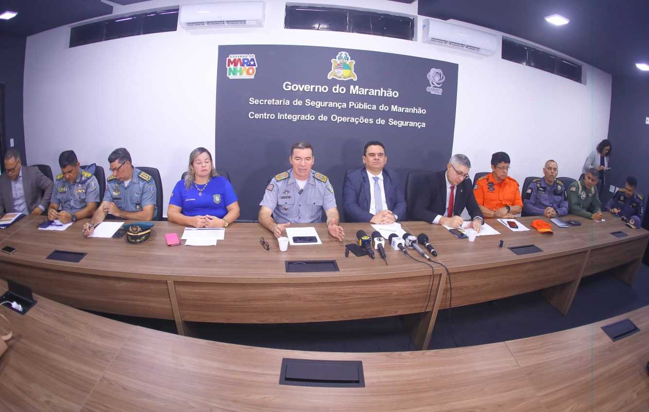 Além do secretário da Segurança Pública, Maurício Martins, participaram da entrevista coletiva o comandante-geral da Polícia Militar, Paulo Fernando Moura, o delegado-geral da Polícia Civil, Jair Paiva, o comandante do Corpo de Bombeiros, coronel Célio Roberto, diretor do CIOPS, coronel Wallace Sousa, a perita geral do Maranhão, Anne Kelly Bastos Veiga, e o tenente-coronel Cabral, do CTA.