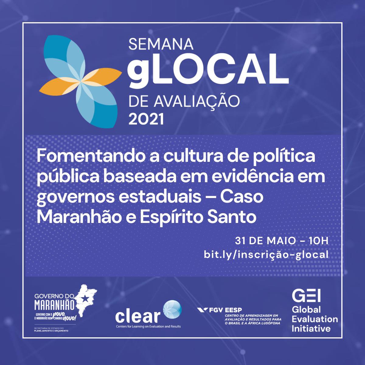 A ação, que acontece nesta segunda-feira (31), a partir das 10h, faz parte da Semana de Avaliação gLOCAL 2021, que tem dois objetivos: a promoção e valorização do conhecimento global que impacta as práticas de monitoramento e avaliação (M&A) das políticas públicas locais e a troca de experiências locais, que influencia o pensamento global sobre os temas de M&A.