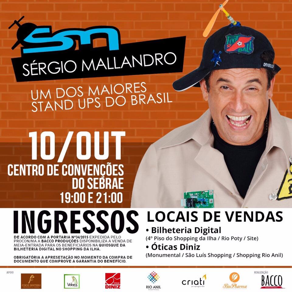 Com um recorde de bilheteria no eixo Rio/ São Paulo e um rápido tempo para desenvolver a comédia no palco, Sérgio Mallandro vem arrancando risos das plateias por onde passa com seu Stand Up Comedy. Não é só glu glu, yeah yeah, são histórias divertidas de situações inusitadas do seu cotidiano como artista. O Stand Up já foi assistido por mais de dois milhões de pessoas no Brasil, e chega no próximo dia 10 de outubro em São Luís, no Centro de Convenções Pedro Neiva de Santana, no Sebrae, e se apresentará em duas sessões, das 19 h e 21h.