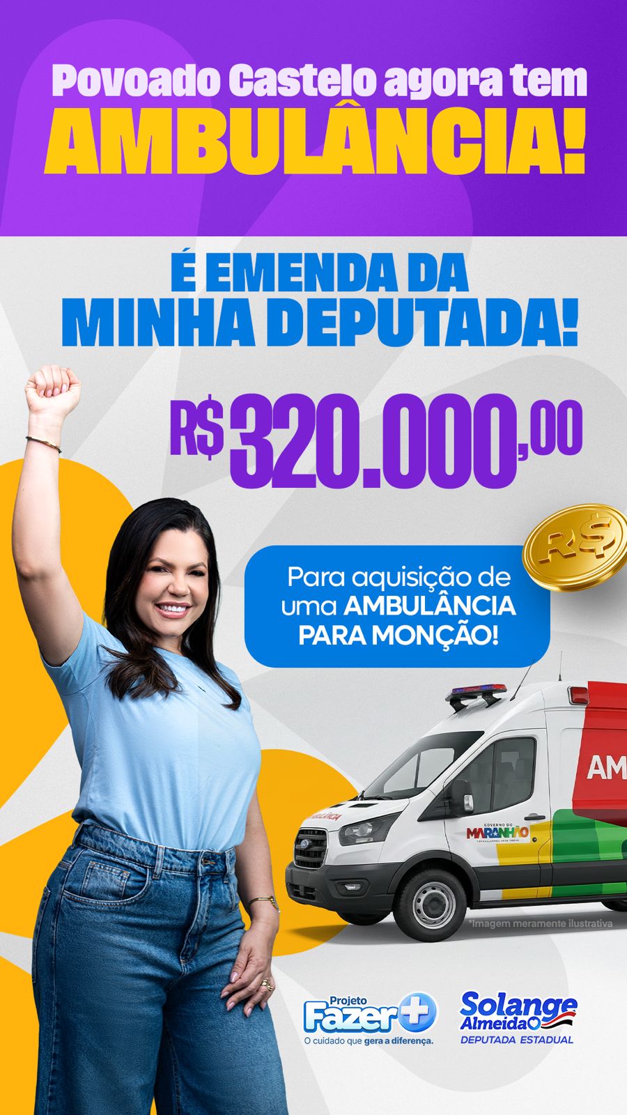 A deputada estadual Solange Almeida (PL) segue fortalecendo os investimentos na área da saúde no Maranhão. Desta vez, a parlamentar garantiu, por meio de emenda superior a R$ 300 mil, a aquisição de uma ambulância para atender a população do povoado Castelo, no município de Monção.