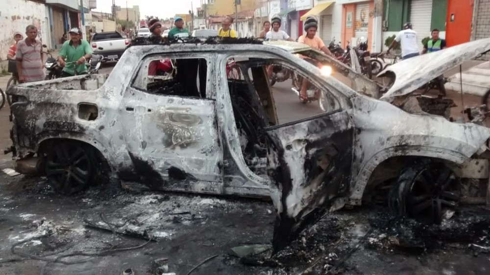 Viaturas das Polícias Civil e Militar foram destruídas pelos bandidos. Um caminhão foi colocado pelos bandidos em fente a Delegacia Regional de Polícia Civil para impedir a saída das viaturas e muitos veículos foram incendiados na delegacia.