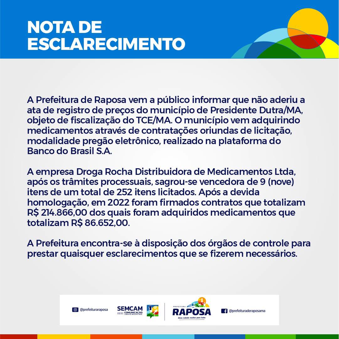 Em decisão tomada pelo pleno do TCE-MA na sessão ordinária desta quarta-feira, 18, foi aceita cautelar pleiteada pelo Ministério Público de Contas (MPC) para determinar ao município de Raposa-MA e à Secretaria Municipal de Saúde daquela cidade a suspensão de pagamentos à empresa Droga Rocha Distribuidora de Medicamentos Ltda. A cidade é administrada pelo Prefeito Eudes Barros (foto acima).