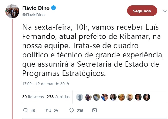 O fato é que Luís Fernando já toma posse como novo membro do Governo Dino na manhã de sexta-feira (15), em solenidade no Palácio Henrique de La Rocque, como bem anunciou o governador, em sua rede social.