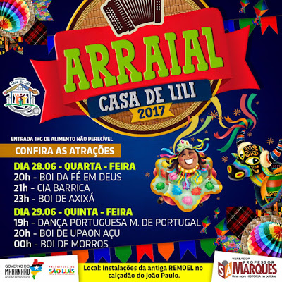 Tudo pronto para a primeira edição do “Arraial Casa de Lili 2017”, festa junina promovida pelo Vereador Sá Marques, que acontece nos próximos dias 28 e 29 de Junho, nas instalações da antiga Remoel, no calçadão do João Paulo.O objetivo é proporcionar dois dias de festa para toda a família ludovicense, com muita alegria, dança, e várias atrações, como por exemplo: Boi de Fé em Deus, Axixá, Upaon Açu, Cia Barrica, Danças e Boi de Morros, pra fechar com chave de ouro.