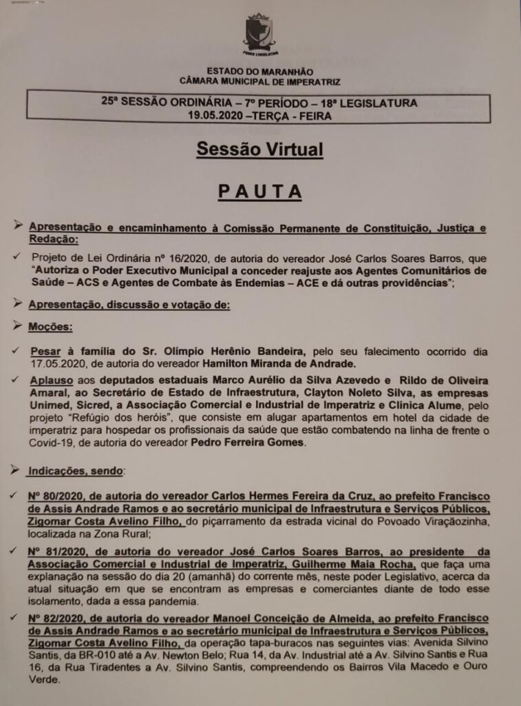 Ao explicar o projeto, o vereador destacou a importância do mesmo para ajudar a frear o contágio na cidade de Imperatriz. “Trata-se de uma medida muito acertada, uma vez que por enquanto o isolamento social continua se mostrando a medida mais eficaz contra o corona vírus. Deixo mais uma vez o meus parabéns aos deputados Marco Aurélio, Rildo Amaral, ao secretário Clayton Noleto, ao Alfredo Wagner, à Unimed, Associação Comercial, Hotel Posseidon e todos os parceiros pela sensibilidade com esses profissionais.