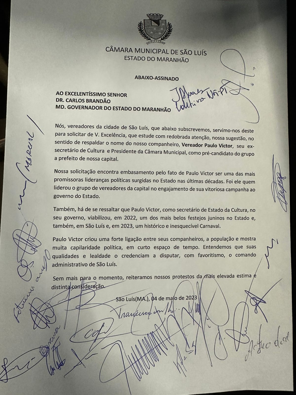 Na ocasião, 28 vereadores assinaram um abaixo-assinado para que Brandão respalde a pré-candidatura de Paulo Victor a prefeito da cidade em 2024.