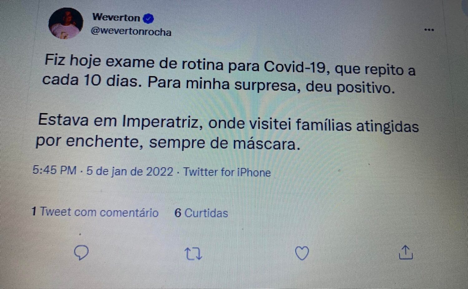 Depois do Governador Flávio Dino, foi a vez do senador Weverton Rocha anunciar que também testou positivo para a COVID-19.